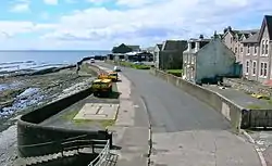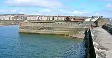 The Earl of Eglinton obtained the right in 1805 to establish a toll gate and levy charges which at first came to £30 a year,[13] however in 1811 they were increased tenfold and Robert Cunninghame decided to build his own waggonway to avoid this toll. The waggonway had at first wood rails attached to stone sleepers, the permanent way being built along the rocks of the foreshore, however the Earl of Eglinton disputed the ownership of the land. Local householders also complained that the waggonway restricted their access to the seashore as the high wall so characteristic of the harbour environs was built to protect the line from the sea. By 1812 the track had reached as far as the Saracen's Head Inn and as the Earl failed to pursue the legal case the waggonway was completed and was in active use with the Stevenston Coal Company owning fifty horses used for hauling the waggons as well as towing the barges.[14]