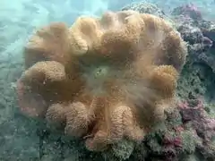 Stichodactyla gigantea has a diameter that is usually no larger than 50 centimetres (1.6 ft) and a maximum of 80 centimetres (2.6 ft).[3] It can appear in a number of colors, commonly brown or greenish and rarely a striking purple or pink, deep blue, or bright green.[4] A healthy S. gigantea will possess tentacles that are extremely sticky to the touch, with firm adherence to surfaces.[4]