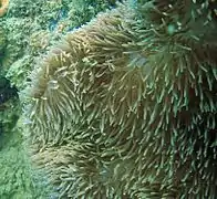 S. gigantea resides on shallow seagrass beds or sand flats around 8 centimetres (3.1 in) deep (at low tide).[5] Most anemones are treated as sessile, but the ones inhabited by anemonefish are in fact motile.[4] Zooxanthellae are obligate symbionts within the anemone.