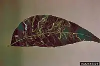The larvae feed on Carya illinoinensis (pecan). They mine the leaves of their host plant. The mine consists of linear (serpentine) mines, just beneath the upper surface of the leaf. If the egg is laid near the center of the leaflet, the early bends of the resulting mine may lie around each other in a spiral because the larvae are unable to cross leaflet veins. If the egg is laid near the margin of the leaf, the mines will often follow leaflet margins.