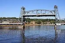The Stillwater Bridge (alternatively known as the Stillwater Lift Bridge, St. Croix River Bridge at Stillwater, Mn/DOT Bridge #4654, and Wis/DOT Bridge #M-61) was a vertical-lift bridge crossing the St. Croix River between Stillwater, Minnesota, and Houlton, Wisconsin. It formerly connected Minnesota State Highway 36 and Wisconsin Highway 64. Around 18,000 vehicles crossed the bridge daily.[2] The new St. Croix Crossing bridge crossing the St. Croix river valley to the south of Stillwater replaced it, having opened to highway traffic on August 2, 2017, leaving the Stillwater Lift Bridge to be preserved and to be converted to bicycle/pedestrian use.[3]