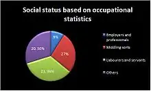From data in 1831[18] the majority of males over 20 were involved in either agriculture or manufacturing and the minority in retail and handicrafts.[18] Most people in Stirchley had a social status of labourers, servants, or 'middling sorts' which are small farmers not employing labourers, however there were some employers and professionals.[17] From the 2001 Census, it can be seen that the majority of the population between 16 and 74 in Stirchley are economically active.[19] Many are employed in the Service industries which includes retail, transport, education and social work.[19]