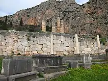 The Stoa of the Athenians is built against the polygonal wall supporting the terrace of the temple of Apollo. The monument has been identified through the inscription of the stylobate: ΑΤΗΕΝΑΙΟΙ ΑΝΕΘΕΣΑΝ ΤΗΝ ΣΤΟΑΝ ΚΑΙ ΤΑ ΟΠΛ[Α Κ]ΑΙ ΤΑΚΡΟΤΕΡΙΑ ΕΛΟΝΤΕΣ ΤΩΝ ΠΟΛΕΜΙΩΝ [The Athenians dedicated the portico and the armaments and the figure heads of the ships that they seized from their enemies]. The "armaments" mentioned in the inscription refer probably to ropes taken from Persian ships, quite possibility the ropes they used to build their extensive pontoon bridge across the Hellespont.[1] On a three-stepped stylobate measuring 26.5 meters long and 3.10 meters wide stand seven monolithic fluted columns of the Ionic order. They are made of Pentelic marble and their bases are made of Paros marble. They are 3.31 meters high. The distance between them is quite large, thus creating openings allowing ample light to enter the building, which was probably covered with a wooden roof. The stylobate and the colonnade have been restored and are extant today in situ. On the polygonal wall at the back of the stoa, particularly on the western part, have been carved about six hundred manumission inscriptions, in the form of fictitious sale of slaves to the god. Most probably, the portico was constructed after the naval victories against the Persians at Mykale and Sestos in 478 B.C.[2] It was used for storing the war spoils, mainly from naval victories against the Persians. War spoils from naval battles at Mykale, Sestos, Salamis and the Hellespont were included.[3]