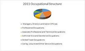 The 1881 Occupational Structure of Stocking Pelham is illustrated in a pie chart below. The chart shows that 46% of the residents at the time were employed in the agricultural sector, hence there was a clear reliance on agricultural labour. In fact, Stocking Pelham was almost completely dependent on primary sector labour with a small fraction of 5% working in 'Professional Labour'.[7] Although, the 2011 Occupational Structure of Stocking Pelham, also depicted in a pie chart below, in accordance to Neighbourhood Statistics shows that since the 19th century, Stocking Pelham has since broke from its dependence on primary sector labour. In comparison to the 1881 Occupational Structure, citizens are no longer heavily dependent on agricultural labour as a means of income and are now harbouring a more diversely skilled workforce, of which 26% are employed in professional occupations and 19.5% are employed as managers, directors and senior officials. The remaining 54.5% of the workforce are reported to be working within the tertiary and secondary sectors.[8]