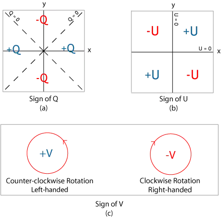 The next figure shows how the signs of the Stokes parameters are determined by the helicity and the orientation of the semi-major axis of the polarization ellipse.