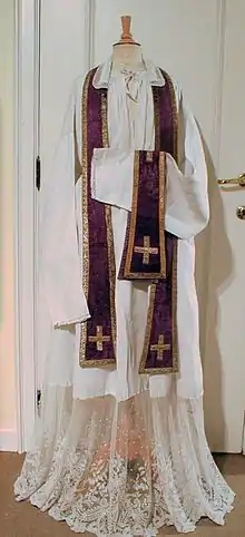 Together with the cincture and the now mostly defunct maniple, the stole symbolizes the bonds and fetters with which Jesus was bound during his Passion;[3] it is usually ornamented with a cross. Another version is that the stole denotes the duty to spread the Word of God.
