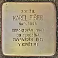 HERE LIVED KAREL FIŠER BORN 1895 DEPORTED 1943 TO THERESIENSTADT MURDERED 6.9.1943 IN AUSCHWITZ |