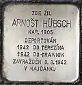 HERE LIVED ARNOŠT HÜBSCH BORN 1905 DEPORTED 1942 TO THERESIENSTADT 1942 TO TRAWNIKI MURDERED 8.8.1942 IN MAJDANEK |