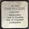 HERE LIVED EMMA KRAUSOVÁ BORN 1875 DEPORTED 1942 TO THERESIENSTADT 1942 TO TREBLINKA MURDERED |