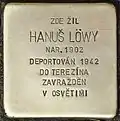 HERE LIVED HANUŠ LÖWY BORN 1902 DEPORTED 1942 TO THERESIENSTADT MURDERED IN AUSCHWITZ |