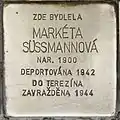 HERE LIVED MARKETÁ SÜSSMANN BORN 1900 DEPORTED 1942 TO THERESIENSTADT MURDERED 1944 |