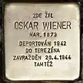 HERE LIVED OSKAR WIENER BORN 1873 DEPORTED 1942 TO THERESIENSTADT MURDERED 20.4.1944 THERE |