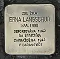 HERE LIVED ERNA LANGSCHUR BORN 1890 DEPORTED 1942 TO THERESIENSTADT MURDERED 1942 IN BARANAVICHY |