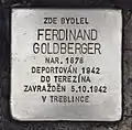 HERE LIVED FERDINAND GOLDBERGER BORN 1878 DEPORTED 1942 TO THERESIENSTADT MURDERED 5.10.1942 IN TREBLINKA |