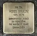 HERE LIVED HUGO BRAUN BORN 1875 DEPORTED 1942 TO THERESIENSTADT TO WARSAW 1942 MURDERED |
