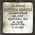 HERE LIVED JINDŘIŠKA KOHNOVÁ NÉE BRUNNEROVÁ BORN 1907 DEPORTED 1941 TO ŁÓDŹ MURDERED IN BELZEC |