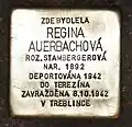 HERE LIVED REGINA AUERBACHOVÁ NÉE STAMBERGEROVÁ BORN 1892 DEPORTED 1942 TO THERESIENSTADT MURDERED 8.10.1942 IN TREBLINKA |