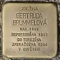 Gertruda Glauberová née Zinner, also called Gertrude or Trude, was born on 24 August 1909 in Hlinsko. Her parents were Ludwig Zinner and Stefanie née Bergmann, also Steffi. She had a sister named Marianna, born on 20 March 1906, later married as Kraus. She married Valtr Glauber (see above). The couple had a son, Karel, born in 1937 (see above). She was arrested, separated from her child and deported to Auschwitz concentration camp. There she was murdered on 16 January 1943.[23][24]
