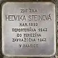 HERE LIVED MARKETA LÖWYOVÁ BORN 1903 DEPORTED 1942 TO THERESIENSTADT 1944 TO AUSCHWITZ MURDERED 4 October 1944 |