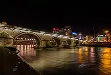 The bridge is considered a symbol of Skopje and is the main element of the coat of arms of the city, which in turn is incorporated in the city's flag.[2] It is located in Centar municipality[3] and it connects Macedonia Square to the Old Bazaar.[4]