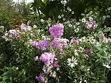 The grounds include woodland and water gardens, a grass garden and a bamboo grove, a rock garden and stone beds with alpine flowers and flower beds of perennials.[2] Blooming plants include Ruta graveolens, Salvia uliginosa and Oxypetalum coeruleum.[2] Systematic order flower beds show more than 50 plant families. An enclosed English flower garden,[1] called "inner sanctum", is enclosed by walls covered with shrubs and roses.[2] Beds of lilies show more than 75 varieties in many colors and shapes. A vegetable garden is protected by a scarecrow named Miss Gertrude Jekyll, after the garden designer who created more than 400 gardens in Europe, especially the UK, and the U.S.[2] The gardens also feature a conservatory and a "display alpine house".[1]