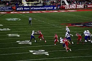 Before the 2017 season started, Stony Brook was predicted to finish 8th out of 12 in the CAA. While they lost the season opener at No. 19 FBS-ranked South Florida, Stony Brook ended the season with a 10–3 record, going 7–1 in CAA play to finish in second place behind James Madison. Their lone conference loss came at home against Delaware.[71] In the regular season finale, Stony Brook won 20–19 at Maine on a Hail Mary which was caught in the end zone as time expired in the fourth quarter; the pass was ranked No. 1 on SportsCenter's Top 10 Plays.[72] Stony Brook received an at-large bid to the FCS Playoffs, beating Lehigh 59–29 in the first round before losing to James Madison in the second round by a score of 26–7.[73][74] The season was the Seawolves' most successful since 2012 as they won more than five games for the first time since joining the CAA. Stony Brook finished the regular season ranked No. 10 in the FCS STATS poll, the team's highest since a No. 6 ranking in 2012.