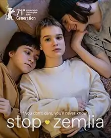 Stop-Zemlia (Ukrainian: Стоп-Земля) is a 2021 Ukrainian romance, coming-of-age and drama film directed and written by Ukrainian director Kateryna Gornostai, and starring Maria Fedorchenko, Arsenii Markov, Yana Isaienko and Oleksandr Ivanov. The feature film portrays a teenage coming of age story.[7] All the depicted events are fiction, but creative team attempted to portray them as improvisations. The characters had a set of activities when the script was written, but they gained traits once the actors were found. The film was first released on May 3, 2021 in Berlin International Film Festival,[8] and received Crystal Bear for the Best Film in the Generation 14plus competition.[9] The film received positive reviews from critics. Later the film appeared at the 12th Odesa International Film Festival (OIFF) on August 19, 2021, where the film received the main award of the festival - the Grand Prix.[10] Kateryna Gornostai also became the winner of Duke in the nomination Best Full-Length Film. On March 9, 2022, the film was awarded the Taras Shevchenko National Prize of Ukraine.