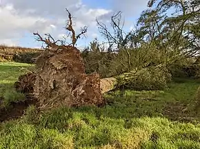 The damage caused by the storm was compounded by the fact that "sustained winds with gusts in excess of 90 mph were, unusually, from the north-east, affecting trees that do not normally have to yield to those winds."[9][10]