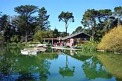 Stow Lake Boathouse is owned by the San Francisco Recreation and Parks Department, who governs all San Francisco public parks. The boathouse has been offering boat rentals since it was constructed in 1893 when it was known as the Strawberry Lake Boathouse. It is unknown who ran the operation until Calvin V. Tilden first leased the property in 1943. In 1971, his son, Calvin B. Tilden, took over and it remained in the family until 2011 when San Francisco Recreation and Parks Department evicted them. There was a protest and controversy over the change in tenants that was led by Suzanne R. Dumont, who created the Save Stow Lake Boathouse Coalition.[2] The concern was that if a corporation took over the operation they would remodel it and destroy the old-fashioned character of the boathouse. Dumont lost her argument with the city and in February 2011 the Board of Supervisors approved the lease to Ortega Family Enterprises, which operates a number of concessions in national parks.[3][4] Ortega received assistance from lobbyist, Alex Tourk, who helped them campaign to get the lease.[5] Ortega did remodel the building, adding a small indoor café, painting the exterior while preserving the original look, and upgrading the kitchen.