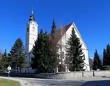 The chapel of ease in Stražišče dedicated to Saint Bartholomew (Slovene: sveti Jernej) was first mentioned in a visitation record in 1631. It was remodeled several times.[1] The bell tower dates from 1734 and the church contains paintings from 1865 by Janez Wolf (1825–1884).[9] The parish church is dedicated to Saint Martin. The original parish church stood next to the Sava River near the current railroad station, along the old Roman road, and was built during an epidemic. It was razed and replaced by the current church in 1735,[1] attributed to the builder Matija Maček (c. 1657–1737) from the Poljane Valley.[10] The church features a Gothic Pietà and Baroque furnishings by Valentin Metzinger, Leopold Layer, Jožef Egartner, Matevž Langus, and Michael Stroy.[11] Saint Martin's Parish was established very early; a parish priest named Arnold was mentioned in 1163, and Filip in 1248.[1]