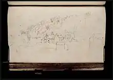 The painting that resulted from this sketch is called "Winchelsea, Sussex, Soldiers on the March c.1828" and depicts a column of soldiers marching up Strand Hill with a group of camp followers seated in the foreground. Soldiers had been stationed in Winchelsea during the Napoleonic Wars to help guard the coast and along the Royal Military Canal which runs along the marshes below the town. The area was also a haunt of smugglers and coastguards often called on the soldiers for support in dealing with them. Turner would have seen the soldiers garrisoned in Winchelsea when he passed through the town in 1816 on his sketching tour.[9]
