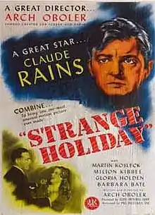 Strange Holiday is a 1945 American movie directed by Arch Oboler. Claude Rains features as a man who returns from a fishing vacation to find America controlled by fascists.