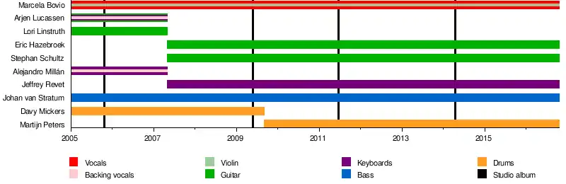 In 2007, Lucassen left the band to continue on his own as he had originally planned, together with his girlfriend guitarist Lori Linstruth, and keyboardist Alejandro Millán; Bovio, her boyfriend (later husband) and bassist Johan van Stratum and producer Joost van den Broek handling the composition duties afterwards. After keeping a steady line-up since 2009, the band announced in April 2016 that they would disband, wanting to end on a high note rather than letting the interest and inspiration fade away, after a live album entitled Memento and a final show on 28 December 2016.