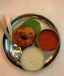 Vada [vəɽɑː] is a common term for many different types of savoury fried snacks from India. Different types of vadas can be described variously as fritters, doughnuts, or dumplings. Alternative names for this food include wada, vade, vadai, wadeh and bara. The various types of vadas are made from different ingredients, ranging from legumes (such as medu vada of South India) to potatoes (such as batata vada of West India). They are often eaten as breakfast or snack, and also used in other food preparations (such as dahi vada and vada pav).