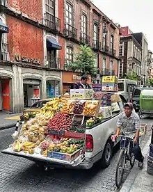 - tianguis and mobile markets (mercados sobre ruedas): These markets take place in a designated place on certain days of the week, with a fixed schedule and supervised by a city inspector for compliance with weights and measurements. These markets are part of the strategy for the supply and distribution of food staples to the city.[10]