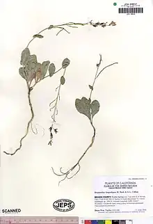 Streptanthus longisiliquus (orth. var. S. longisiliqus) is a species of flowering plant in the mustard family known by the common name long-fruit jewelflower.[1] It was first described to science in 2007.[2] It is endemic to northern California, where it is known from Butte, Tehama, and Shasta Counties. It can be found in forest and woodland habitat in mountains and foothills. It is a short-lived perennial herb producing a few-branched stem up to 1.2 to 1.5 meters in maximum height. It is mostly hairless except for some light hairs on the inflorescences and sometimes the leaf petioles. The basal leaves have oval or spoon-shaped blades up to 10 centimeters long, usually with smooth edges. Leaves higher on the stem are oval or oblong and lack petioles, their bases often clasping the stem. Flowers occur at intervals along the upper stem. Each flower has a bell-shaped calyx of sepals which yellow-green at the base and purplish at the tip, measuring under a centimeter in length. The petals emerging from the end are brownish or purplish with greenish bases. The fruit is a flattened, curving silique that can be quite long even for the genus, measuring up to 15 centimeters in length.