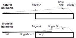 Playing a string harmonic (a flageolet) is a string instrument technique that uses the nodes of natural harmonics of a musical string to isolate overtones. Playing string harmonics produces high pitched tones, often compared in timbre to a whistle or flute.[1][2] Overtones can be isolated "by lightly touching the string with the finger instead of pressing it down" against the fingerboard (without stopping).[3]