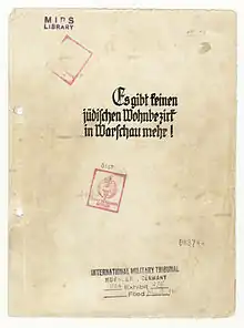 The two known copies held by the Allies were introduced as evidence at the International Military Tribunal in Nuremberg, sharing the document number 1061-PS, and used in the trial as "US Exhibit 275".[1] The report was first displayed by the chief U.S. prosecutor Robert H. Jackson for the judges during his opening address.[6] The assistant prosecutor dealing with the persecution of the Jews referred to it as "the finest example of ornate German craftsmanship, leather bound, profusely illustrated, typed on heavy bond paper ... the almost unbelievable recital of the proud accomplishment by Major General of Police Stroop".[7] Both copies were also used in Nuremberg in the 1947 trial of Oswald Pohl, as exhibit 503.