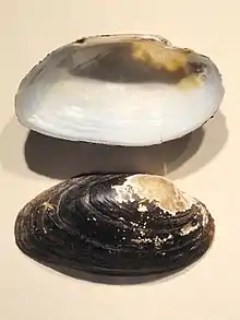 This mussel has a somewhat flattened, smooth, oval shell which is thin in young animals and becomes thicker with age. It is green, brown, or black in color with pink to orange nacre. It grows up to 10.2 centimeters long. The beak is ridged.[2][3]