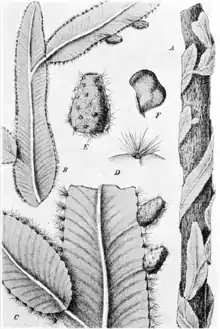 The systematic position of the species has been disputed. Nathaniel Lord Britton and Joseph Nelson Rose created the monotypical genus Strophocactus in 1913 with the only species Strophocactus wittii.[9] They derived the botanical name of the genus from the Greek noun στροφή strophe for "wind, twist" because the shoots wound or twisted around the host plant. In 1986, Gordon Rowley transferred the species to the genus Selenicereus due to its flower structure.[10] In 2003, Ralf Bauer suggested that Strophocactus should be recognized again and that Selenicereus wittii should be re-classified in this genus.[11]