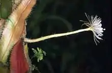The salver-shaped flowers are up to 27 cm long and reach a diameter of 12.5 cm. The long, slender flower tube measures just 9 mm in diameter. The tepals then spread out flat. They are pure white and intensely reflect ultraviolet light. The hypanthium and the flower tube are scaly and covered with hair-like spines. The nectaries at the base of the flower secrete a large amount of clear nectar. The stigma lobes and the lower portion of the style are warty (papillose). The pollen grains of Strophocactus wittii are hexacolpate, that is, they have six instead of three germ folds on the surface of the pollen grains.[3]