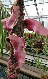 Strophocactus wittii grows as a epiphyte, creeping and climbing up trees. The richly branched, leaf-like, flattened stems are phylloclades, and are pressed close to the tree trunks of their carriers and form aerial roots along their midrib. When exposed to direct sunlight, the elliptical to lanceolate, dark green shoots turn dull red due to strong betalain pigmentation and are therefore clearly visible from a distance. Each segment is up to 60 cm long and 6–14 cm wide, but only 2 to 4 mm thick. Their edges are slightly notched, and are covered with white woolly areoles about every 8–10 mm. Up to 20 needle-shaped, whitish spines up to 12 mm long arise from the areoles.[3][4][5]