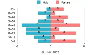 According to the 2002 Poland census, there were 67 people residing in Strużki village, of whom 50.7% were male and 49.3% were female. In the village, the population was spread out, with 20.9% under the age of 18, 38.8% from 18 to 44, 20.9% from 45 to 64, and 19.4% who were 65 years of age or older.[2]
