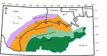 The Wilcox growth fault province formed throughout present-day onshore Texas and Louisiana during the Paleocene and Eocene. The series of listric growth faults developed when sediment loading stimulated the collapse of salt bodies, which facilitated slumping toward the center of the basin.[7]