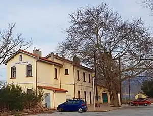 Strymonas railway station (Greek: Σιδηροδρομικός Σταθμός Στρυμώνα, romanized: Sidirodromikós stathmós Strymona) is a railway station that servers the former municipality Strymonas, and the nearby settlement of Charopo in Serres in Central Macedonia, Greece. The station is located just west of the settlement 2.9 kilometres (1.8 mi) (39 Min walk). The neoclassical station building (as of 2021) is unstaffed.