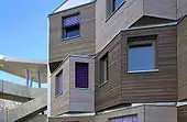 The architecture of the Studentendorf Adlershof is dominated by the so-called thinker-bays (Denker-Erker), which characterise each residential unit. The Denker-Erker is simultaneously a place of retreat as well as a viewpoint. Through the different orientation of the Denker-Erker, the orientation of the windows, the shades of grey of the wood panel and the coloured sunshades the pre-fabricated facade is softened. These variations make each building unique.
