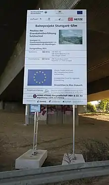 The 2003 federal transport plan included it as an urgent project. It includes a new high-speed line between Stuttgart and Ulm with a maximum speed of 250 km/h, parallel to the existing Stuttgart–Ulm line and an upgraded Ulm–Augsburg line with a design speed of up to 200 km/h. On 19 July 2007 it was announced by the Federal Government, the State of Baden-Württemberg and Deutsche Bahn AG that the project had been officially approved.[1][2] The estimated cost of the whole project is € 4.088 billion, with funding to be provided by Deutsche Bahn (€ 1,469 million), Federal Government and the European Union (€ 1,229 million), Baden-Württemberg (€ 824 million), Stuttgart city (€ 239 million) Stuttgart region (€ 100 million) and the owners of Stuttgart Airport (€ 100 million).[3]