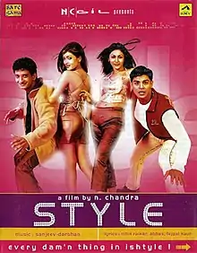Style is a 2001 Indian Hindi language comedy thriller film directed by N. Chandra. Sharman Joshi and Sahil Khan made their debut in the Indian Film Industry as duo named Chantu and Bantu.[3] According to MenXp the film was an instant hit. A sequel titled Xcuse Me was released in 2003. Fifteen years since its release, MenXp in its review in 2018, called the movie a cult hit.[4]