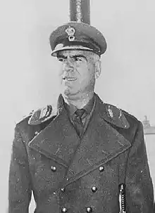 He, along with Georgios Papadopoulos and Nikolaos Makarezos, planned and executed the coup on the night of April 20 to April 21, 1967, claiming political anomaly had made them do so.[6][19] Many leading politicians and journalists were arrested that night and were led to a hotel in Pikermi. Among them were Kοnstantinos Mitsotakis, Andreas Papandreou, Georgios Rallis, Manolis Glezos.[20] Pattakos was assigned the Ministry of the Interior.[21] He became also the vice president of Kollias government.[16] As head of that post, Pattakos made the decision to strip Greek actress and political activist, Melina Mercouri, of her Greek citizenship and to also confiscate her property.[22] Mercouri retorted "I was born Greek. I will die Greek. Mr. Pattakos was born a fascist. He will die a fascist".[23][24][25][26][27] On 25 November 1973, Brigadier General Dimitrios Ioannides overthrew Papadopoulos.[28] The following year, the 7-year Junta came to an end in the aftermath of the Turkish invasion of Cyprus.[29]