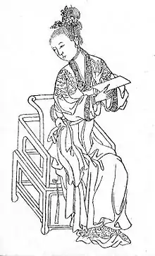 Su Hui (simplified Chinese: 苏蕙; traditional Chinese: 蘇蕙; pinyin: Sū Huì, fourth century CE) was a Chinese poet of the Middle Sixteen Kingdoms period (304 to 439) during the Six Dynasties period. Her courtesy name is Ruolan (traditional Chinese: 若蘭; simplified Chinese: 若兰; pinyin: Ruòlán). Su is famous for her extremely complex "palindrome" (huiwen 回文) poem, apparently having innovated this genre, as well as producing the most complex example to date.[1] Su Hui is depicted in the Wu Shuang Pu (無雙譜, Table of Peerless Heroes) by Jin Guliang.